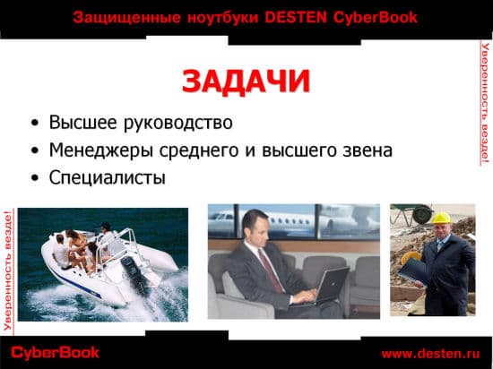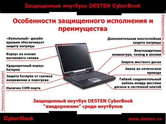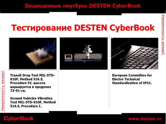 Производитель утверждает, что эти ноутбуки (учитывая также наличие СОМ-порта) придутся ко двору в большом количестве отраслей, где необходимо иметь ноутбук с собой, и при этом сложно обеспечить «тепличные» условия эксплуатации. Ноутбуки Desten CyberBook подойдут инженерам в различных отраслях, сотрудникам силовых ведомств, разъездным менеджерам и пр.