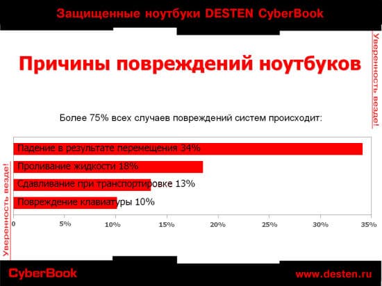 При этом, по некоторой статистике, значительная часть выходов из строя ноутбуков происходит вследствие механических повреждений, полученных при определенных обстоятельствах. Самые прозорливые читатели уже наверняка догадались, какие повреждения являются основными. Они, а также примерный процент обращений по ним, показаны на слайде.