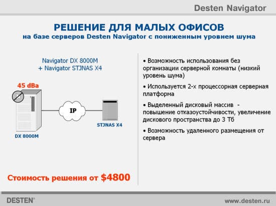 Третье предлагаемое решение — решение для малых офисов, основными особенностями которого является очень низкий уровень шума (что позволяет располагать сервер в офисных помещениях) и вынесенный отдельно дисковый массив, который также можно «добивать» по мере увеличения потребностей.