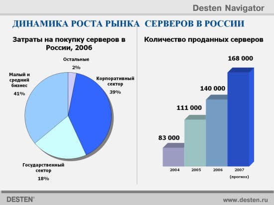 Итак, как видно из представленной диаграммы, рынок серверов растет достаточно быстрыми темпами, как за счет развития российского бизнеса, так и за счет более цивилизованной информационной политики в уже существующих предприятиях.