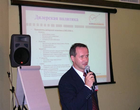 О направлениях развития дилерской политики в 2003 — 2004 годах рассказал Александр Круглов — директор по дистрибуции. EuroBusiness предоставляет своим партнерам кредиты, принимает любые формы оплаты, обеспечивает бесплатную доставку со склада в Москве, доставляет товары в регионы, осуществляет информационную и маркетинговую поддержку, проводит программы стимулирования продаж, поддерживает сервисные центры дилеров.