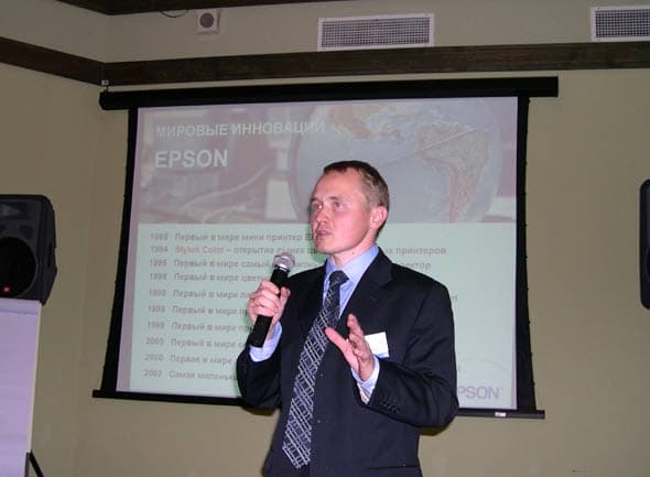 Epson поблагодарили компанию EuroBusiness за проделанную работу (в апреле этого года компания удвоила среднемесячные продажи расходных материалов Epson по сравнению с 2002 годом) и рассказали о новых моделях продукции, о которых мы совсем недавно писали .