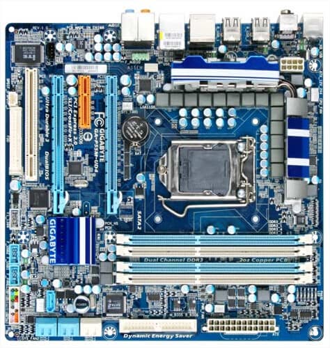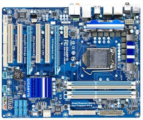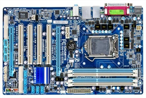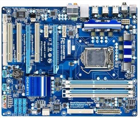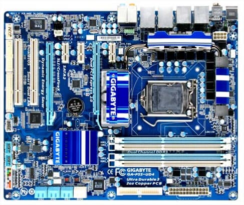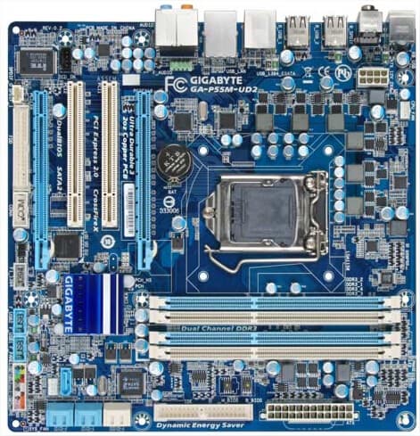 GA-P55-UD3 — упрощенный вариант предыдущей платы. Здесь питание процессора обеспечивает 4-фазная система, упразднены разъемы eSATA на задней панели, а вместо четырех слотов PCI на плате имеется только три.