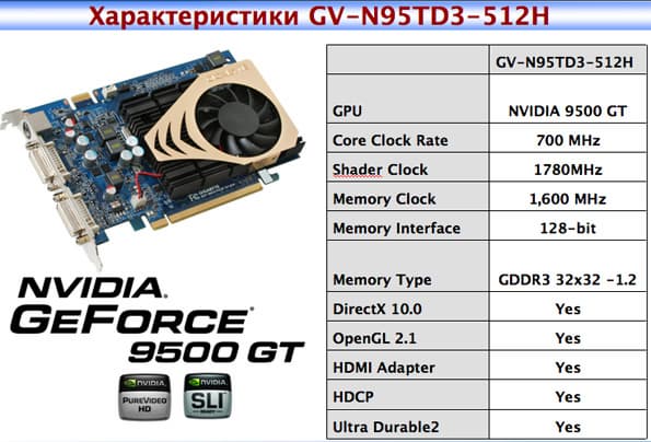 Плата GV-N95TD3-512H — на процессоре GeForce 9500 GT, работающем на частоте 700 МГц. Частота шейдерного блока составляет 1780 МГц, а памяти DDR3 — 1,6 ГГц.