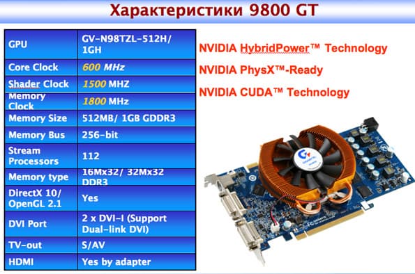 На базе NVIDIA 9800 GT появилось два ускорителя: GV-N98TZL-512H и GV-N98TZL-1GH. На картах применены оригинальные системы охлаждения с использованием кулеров Zalman. В зависимости от модели карты оборудованы 512 МБ или 1 ГБ памяти DDR2 с шиной 256 бит. Подробные характеристики: