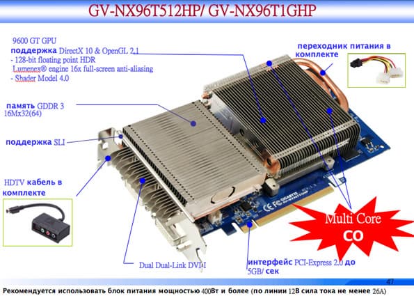 GV-NX96T512HP и GV-NX96T1GHP на процессоре GeForce 9600 GT выпускаются с бесшумной системой охлаждения. Платы оборудованы 512 МБ или 1 ГБ памяти DDR3 с шиной 256 бит.