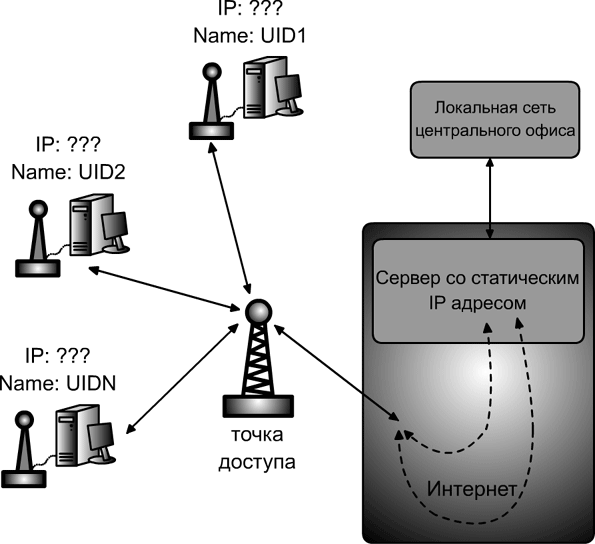 С одной стороны, способ подкупает простотой и скоростью включения каждого нового устройства в работу, а с другой он требует довольно продвинутого программного обеспечения (как на сервере, так и на удаленных компьютерах), которое ориентировалось бы в постоянно меняющихся связях между устройствами в сети, а также было бы надежно защищено от несанкционированных хакерских атак из интернета.