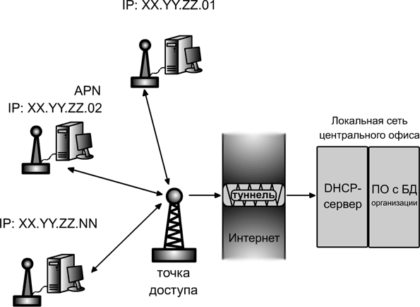 - Системному администратору пришлось настраивать туннель с dhcp-сервера нашей организации до сервера сотового оператора, обслуживающего выделенную организации точку доступа. Как оказалось, эта проблема вполне решаема, хоть и приносит много хлопот. Трафик через интернет для работы dhcp-сервера будет расходоваться только в центральном офисе, и измеряться будет мегабайтами, а не временем работы в сети (чего мы и добиваемся). Однако тут стоит иметь в виду, что данная услуга у всех сотовых операторов включается только за абонентскую плату, с включенным предоплаченным трафиком от 5 до 25 Мб. Считайте экономическую выгоду сами — если вас это устраивает, то всё в порядке. Нашу организацию это устроило не во всех случаях, поэтому был применен и другой вариант.