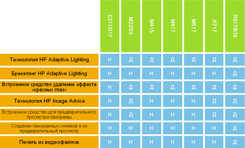 HP Photosmart E317, HP Photosmart M415 и HP Photosmart R817/R818 могут записывать видеоклипы со звуковым сопровождением. Поддержка технологии HP Instant Share дает возможность отправлять фотографии по электронной почте, обходясь без громоздких вложенных файлов, а технология PictBridge облегчает процесс распечатывания фотографий.