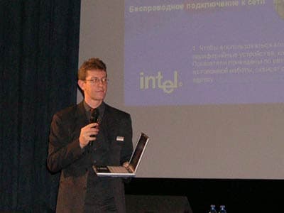- Настольные ПК на базе процессоров Intel Pentium 4 с поддержкой технологии Hyper-Threading идеально подходят для многозадачных сред, часто встречающихся при малом бизнесе. Бернхард Рис наглядно продемонстрировал всем участникам Форума преимущества технологии HT — в зале было установлено две системы со схожими характеристиками, только одна из них поддерживала HT, а другая нет; на компьютерах были запущены одинаковые тестовые примеры, и было видно невооруженным глазом, что система с поддержкой Hyper-Threading справляется с задачами гораздо быстрее.