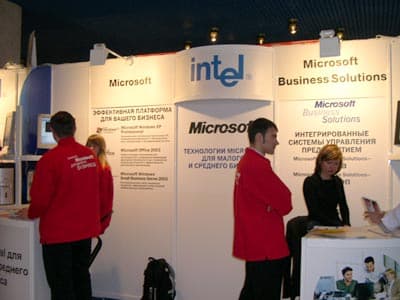 Компания Microsoft условно разделила свой стенд на две части — в одной из них были представлены Small Business Server, специально созданное универсальное решение для небольших компаний, и Office System 2003, официальное представление которой прошло в Москве в первых числах декабря, а в другой — продукты Microsoft Business Solutions-Navision и Microsoft Business Solutions-Axapta.