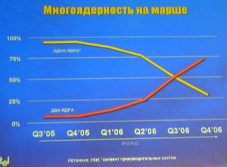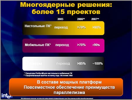 Специалисты Intel прогнозируют, что к концу 2007 года практически все серверы, а также девять из десяти ноутбуков и настольных ПК, будут строиться на базе многоядерных процессоров.
