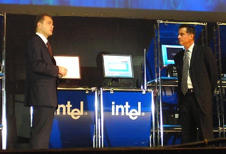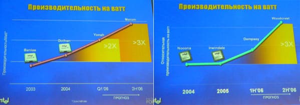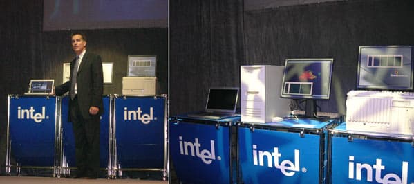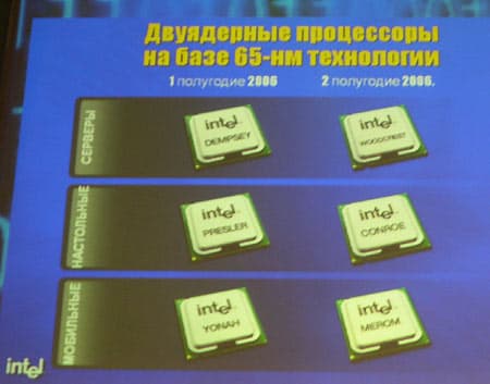 Первые образцы систем, построенные на базе новых процессоров с кодовыми наименованиями Merom, Conroe и Woodcrest, предназначенных для платформ для ноутбуков, настольных систем и серверов соответственно, красовались на сцене конференц-зала. Демонстрируя их собравшимся, Том Килрой еще раз подчеркнул, что они предоставят пользователям исключительную производительность и эффективность энергопотребления.