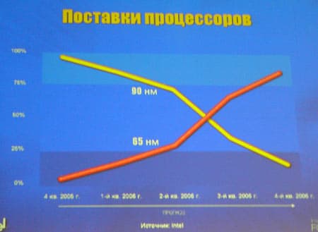 Предсказуемым следствием активной экспансии новых процессоров, созданных по 65-нм технологии Intel, станет стремительный массовый переход на этот техпроцесс. Как видно на слайде, уже к концу будущего года 65-нм кристаллы займут господствующее положение, оттеснив своих 90-нм предшественников.