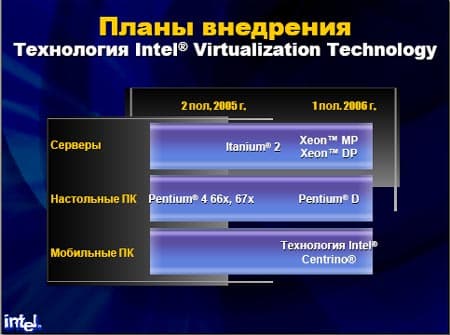 Технология виртуализации Intel Virtualization Technology представляет собой набор аппаратных улучшений процессора, которые реализуют виртуализацию в сочетании с соответствующим программным обеспечением. Она позволяет сократить совокупную стоимость владения IT-инфраструктурой благодаря улучшенной управляемости и стабильности платформ, формирует базу для повышения безопасности вычислений. Intel планирует внедрить эту технологию во все типы платформ и, заметим, совсем скоро.