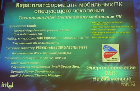 Доклад г-на Идена, как и следовало ожидать, был посвящен платформе для мобильных ПК нового поколения — Napa, которая призвана сделать ноутбуки еще более популярными среди бизнесменов и обычных потребителей, предоставив им новые преимущества.