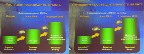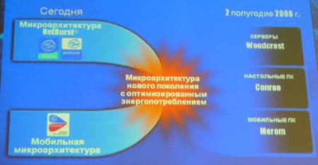 В ходе своего доклада он заявил, что, стремясь достигнуть наилучшего соотношения «производительность/ватт», которому в последнее время корпорация уделяет очень большое внимание, во второй половине 2006 года Intel выводит на рынок новую микроархитектуру. Она будет использоваться во всех трех платформах — мобильной, настольной и серверной, — сочетая лучшие черты сегодняшних микроархитектур Intel: архитектуры Intel NetBurst и мобильной микроархитектуры. Разумеется, в нее также будут добавлены новые функциональные возможности.