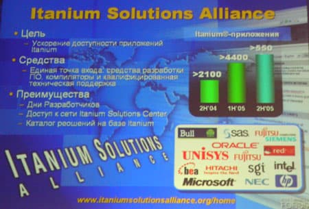 Он также упомянул о недавнем создании альянса Itanium Solutions Alliance, направленного на продвижение решений на базе архитектуры Itanium. В списке первостепенных задач альянса — облегчение системным интеграторам задачи переноса приложений на платформу Itanium. Среди членов Itanium Solutions Alliance как производители оборудования, так и разработчики программного обеспечения: Bull, Fujitsu, Fujitsu Siemens Computers, Hitachi, Hewlett-Packard, SGI, Unisys и BEA, Microsoft, Novell, Oracle, Red Hat, SAS.