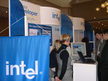 Выставка Intel заняла 8 стендов, на которых можно было увидеть демонстрацию возможностей широкополосной беспроводной связи в сети стандарта 802.16a, содержащей базовую станцию («точка» — «много точек») и станцию абонента. На одном из стендов можно было познакомиться с программой поддержки разработчиков ПО — Intel Developer Services, а также зарегистрироваться для участия в ней.