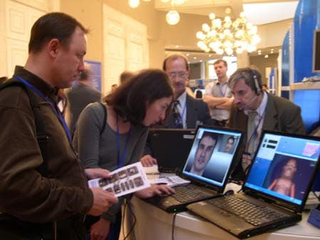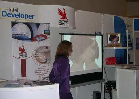 На стендах нижегородского Центра Intel по разработке программного обеспечения можно было увидеть очень интересную демонстрацию возможностей архитектур и технологий Intel в области трансляции и обработки аудио- и видео-потоков. Наглядно была продемонстрирована технология создания синтетического видео, включающая в себя полностью автоматическое распознавание и отслеживание мимики и движений головы говорящего человека, расчет и передачу по сети параметров анимации лица, создание персонализированной модели человека-участника конференции, анимацию и визуализацию произвольной модели в соответствии с полученными параметрами анимации. Звучит это довольно запутано, но выглядит это так — например, мимику человека отслеживает видеокамера, которую затем воспроизводит созданная модель.