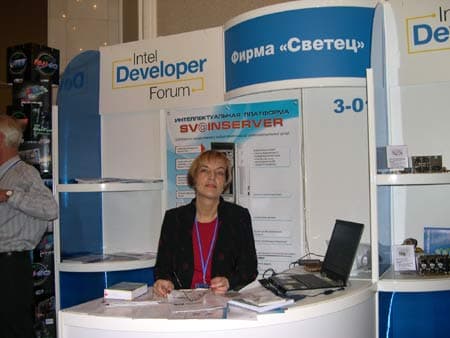 Теперь осталось рассказать о выставке, которая была проведена в рамках Форума Intel для разработчиков. Практика организации подобных выставок передовых компьютерных и коммуникационных технологий является традиционной для всех IDF и позволяет разработчикам увидеть воочию новинки и последние разработки, демонстрирующие уровень развития современной цифровой индустрии. На этот раз в выставочной программе Форума приняли участие около 30 компаний-лидеров мирового и российского рынка высоких компьютерных и коммуникационных технологий.