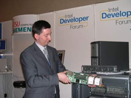 На стенде компании Fujitsu Siemens Computers были представлены мобильные продукты, созданные на базе технологии Intel Centrino для мобильных ПК, а также модульные серверы PRIMERGY BX 300.
