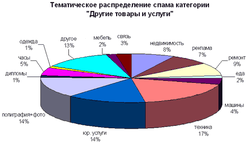 Типичное для Рунета явление — 30% от общего объема спама занимает категория «Другие товары и услуги». Это связано с тем, что в России к услугам спамерских рассылок часто прибегают представители малого бизнеса, зачастую не видя разницы между спамом и любым другим видом рекламы.
