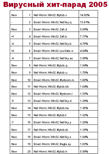 В первой половине двадцатки самых распространенных вредоносных программ в почтовом трафике в 2005 году оказалось пять новых представителей, а во второй — восемь.