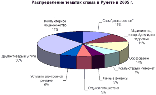 Тематические лидеры спама в Рунете практически не изменились с прошлого года. Единственное новшество, о котором упомянула г-жа Власова, категория «Компьютерное мошенничество» вышла на лидирующие позиции: