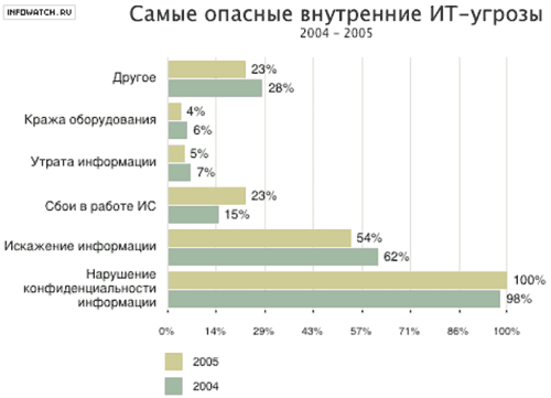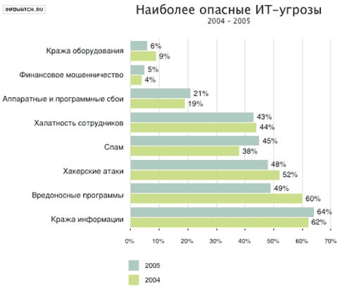 Список наиболее опасных ИТ-угроз, которые вызывали обеспокоенность респондентов в 2005 году, не претерпел значительных изменений как в количественном, так и в качественном плане. Печальная группа лидеров — кража информации, вредоносные программы, хакерские атаки, спам и халатность сотрудников.