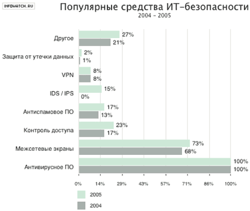 Как и в 2004 году, самым популярным средством ИТ-безопасности оказались антивирусы. Небольшой рост зарегистрирован в отношении межсетевых экранов.