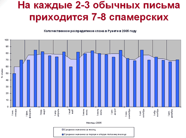 В течение года наблюдался небольшой, хотя и уверенный рост доли спама в электронной почте. Речь идет именно о соотношении долей — в абсолютных значениях к концу 2005 года количество спама возросло в 1,5-2 раза по сравнению с аналогичным периодом 2004 года. В общем объеме почтового трафика на каждые 2-3 обычных письма приходится 7-8 спамерских.