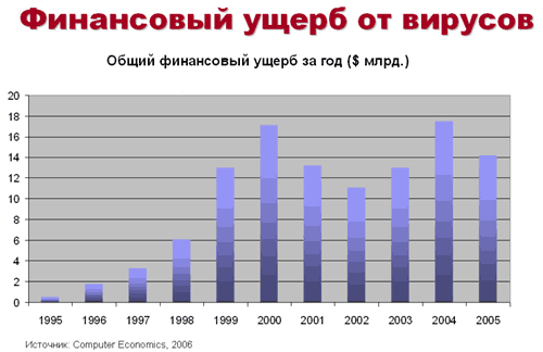 Сейчас уже с уверенностью можно говорить, что подавляющее большинство вредоносных программ (более 75%) разрабатывается ради наживы. Если говорить о краже финансовой информации (например, данных доступа к персональным банковским счетам), то для этих целей глобальные эпидемии не нужны, так как для обработки объемного массива данных, полученного с большого числа зараженных компьютеров, требуется слишком много людей, что ведет к повышению опасности для преступников. При этом, совершая целевые атаки на конкретные компании или группы пользователей, злоумышленники стараются действовать незаметно и в течение не очень продолжительного времени. В связи с этим снижается и прямой ущерб ИТ-инфраструктурам компаний, который по данным, представленным Computer Economics, оценивался в 2005 году на уровне 14 млрд. долл. (в 2004 году на восстановление ИТ-инфраструктур компаний, по данным того же источника, было затрачено около 18 млрд. долл.).