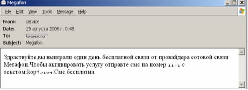 Еще одна модификация идеи о «волшебных кошельках» — это «магические» SMS. Спамеры, например, предлагали отправить SMS по указанному номеру и обещали за это пополнить его счет. При отправке SMS со счета пользователя снималась определенная сумма денег, часть которой попадала на счет спамеру, а другая часть шла оператору связи за предоставленную услугу перевода. От этой операции, очевидно, счет отправившего SMS пополниться никак не мог.