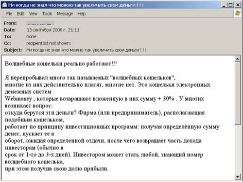 Так, например, российские спамеры взялись за разработку мифической идеи о существовании уязвимостей в платежных системах (WebMoney, Яндекс.Деньги и т.п.), которые позволяют переводить на счета «левые» суммы денег. Неизвестно, каково происхождение этого мифа, но сказки о «волшебных кошельках», в которые верят неопытные пользователи, похоже, принесли спамерам немалую финансовую выгоду.