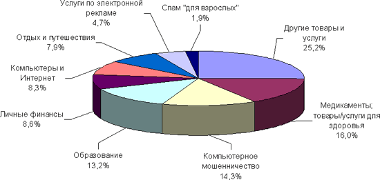 Именно этот спам и являлся своеобразной товарной спецификой Рунета в 2006 году. Долгое время он был слишком разнороден и разнообразен, чтобы выделить в нем четко очерченные тематические подгруппы, но в последнее время существенно выросло количество предложений юридических, риелторских и полиграфических услуг по отношению ко всему объему спама. Их доли, если рассматривать усредненные данные за последние три месяца 2006 года, распределились следующим образом: юридические услуги и аудит — 4%, недвижимость — 3,3%, полиграфия — 2,1%.