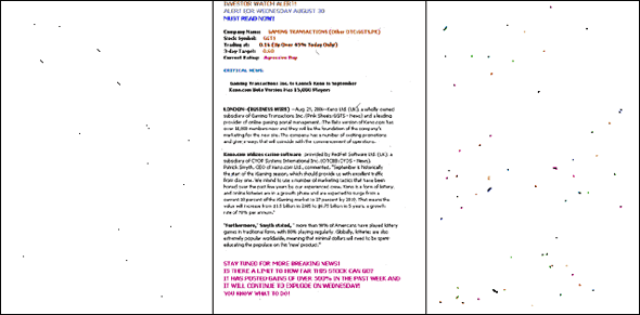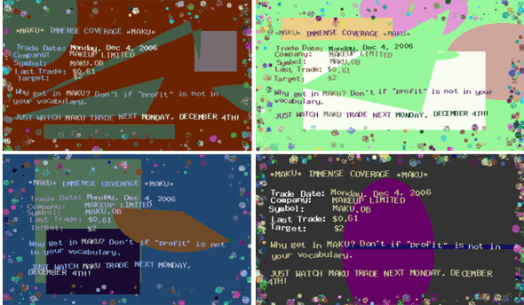 Возвращаясь к тенденциям рынка, следует заметить также, что неожиданным для аналитиков в 2006 году стал взрывной рост «финансового» спама, призывающий покупать акции малоизвестных компаний. Причем несмотря на то, что эксперты предварительно отнесли этот спам к тематической группе «Личные финансы», этот вид рассылок явно тяготеет к криминализированному. Письма содержат недостоверную информацию и умышленно завышенную оценку потенциально возможного роста стоимости акций.