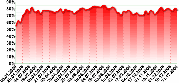 На графике количественного распределения спама в Рунете в 2006 году хорошо видно, что его доля в общем почтовом трафике в течение года составляла 70-80%. Минимальное значение доли спама в Рунете — 44,1% — было зафиксировано 4 января 2006 года, а максимум составил 91% и был зафиксирован 26 ноября 2006 года. В целом график долевого распределения спама в 2006 году оказался более «сглаженным», чем в 2003-2005 гг.: он практически не содержит ярко выраженных подъемов и спадов продолжительностью более 1-2 дней. Единственный заметный спад на графике — это новогодние праздники.