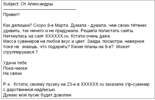 Спамеры обратились непосредственно к тексту сообщений. Теперь некоторые спамерские тексты стилистически и лексически оформляются как личная переписка. «Часто такой спам не содержит обращений или содержит обращения вида «подруга», «малышка» и т.п., чтобы создать у пользователя иллюзию, что письмо было адресовано именно ему, — подчеркнула Анна Власова, — Иногда в подделке под личную переписку упоминаются и имена. В любом случае, пользователь может захотеть разобраться, что это за сообщение, откуда, не надо ли его куда-то переслать, и, как минимум, прочтет экземпляр спама».