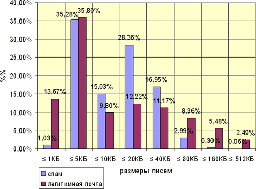 Что касается размера спамовых писем, то, как и в легитимном почтовом трафике, больше всего писем — около 35% — это сообщения размером от 1 до 5 Кб. Помимо этого, популярен также спам, размер которого попадает в интервал от 10 до 20 Кб. Данное явление можно связать с рассылками «графического» спама.