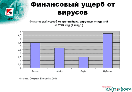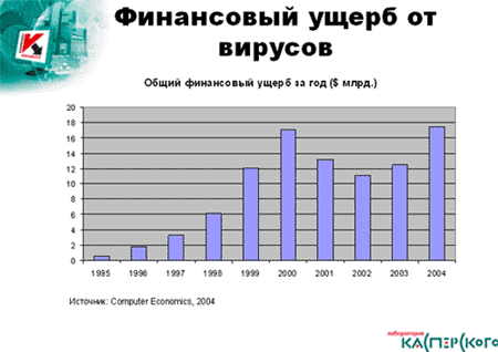 Вирусные эпидемии становятся более масштабными, их последствия — все более разрушительными, и каждый из нас свидетель этому. Ладно еще когда свидетель, а когда пострадавший?! :) Если раньше вирусописательством, по большей части, занимались энтузиасты, не нашедшие другого способа выразить свой талант, то сегодня создание вредоносного кода поставлено на бизнес-рельсы и приносит огромный нелегальный доход. Этот доход довольно легко подсчитать, достаточно лишь сложить прибыли злодеев ;). Но вот только кто же из них будет рассказывать о своих победах? :) Определить размер убытков, как вы понимаете, еще сложнее: дело не в том, что пострадавшие не хотят обнародовать свой ущерб, просто не все потери можно оценить в денежном эквиваленте. Аналитики могут дать лишь очень приблизительные цифры, зачастую беря за основу лишь прямой ущерб (потеря информации, время на восстановление работы сетей, время простоя и т.п.). Так, например, Computer Economics оценивает общий финансовый ущерб от вирусов за 2004 год почти в 18 млрд. долл. Причем, по мнению Евгения Касперского, эта сумма значительно занижена и не включает данные по кражам со счетов, финансовый ущерб от спама и др.