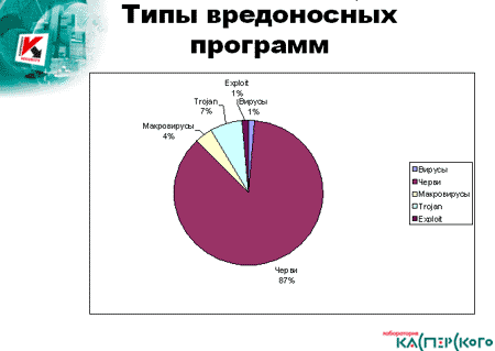 Доминирующей разновидностью вредоносных программ в течение всего года оставались почтовые черви. На втором месте рейтинга оказались различные троянские программы, в том числе бэкдоры (backdoors, программы скрытого удаленного администрирования). Традиционные вирусы и макровирусы составили незначительную долю от общего числа. В итоговой статистике можно увидеть эксплойт. По мнению аналитиков «Лаборатории Касперского», это в полной мере отражает неприятный факт, что все растущее число обнаруживаемых уязвимостей в браузере Internet Explorer не остается незамеченным вирусописателями, и за каждой найденной уязвимостью обязательно следует создание вредоносной программы, ее использующей.