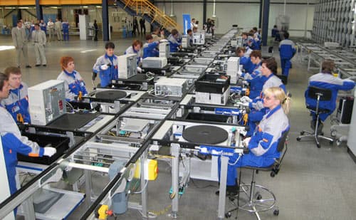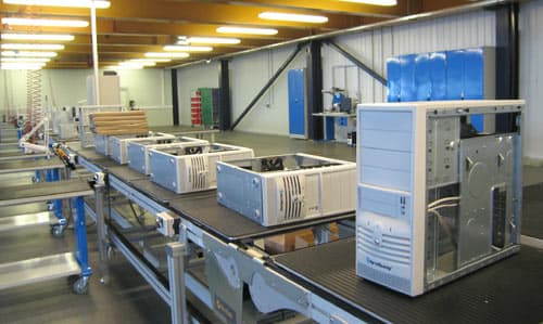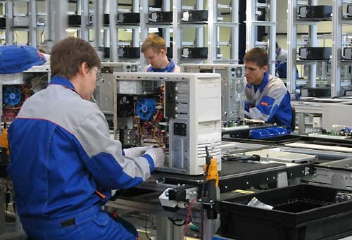Производство имеет зону подготовки, где осуществляется входная проверка комплектующих, зону сборки, зону предварительного тестирования (настройка BIOS, проверка работы портов) и зону тестирования, где при помощи промышленных тестов проверяется работа всех компонентов компьютера.