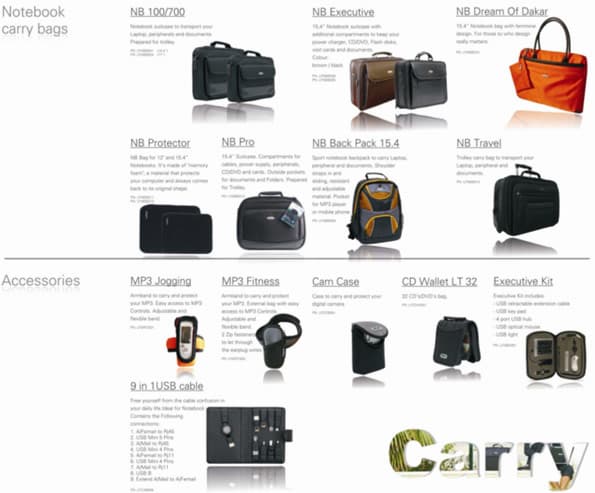 Еще одна категория — «Носи» — включает сумки для ноутбуков, чехлы для MP3-плееров, CD-дисков и фотокамер, наборы USB-аксессуаров.