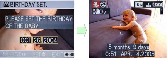 Из новых режимов наиболее интересен, пожалуй, «малыш». Он несколько смягчает фокусировку в зоне телесного цвета, позволяя передать на фотографии бархатистую нежность детской кожи, а главное — запоминает дату рождения ребенка и затем автоматически помечает его возраст на каждой новой фотографии. Здесь может возникнуть вопрос: «А если малыш не один?» Чтобы лишний раз не переставлять дату рождения, счастливым родителям можно порекомендовать запастись несколькими фотоаппаратами или, установив день рождения одного из детей, потренироваться в устном счете :)).