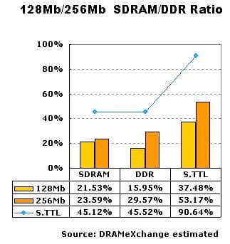 Во-вторых, созрела потребность в переходе на DDR и новые технологические процессы — к марту цена на все типы памяти (SDRAM, DDR и Rambus) была примерно одинакова и находилась в пределах $35 — $44 за 128 М, модуль, а уровень производства SDRAM составлял 64%, тогда как DDR — лишь 30%.