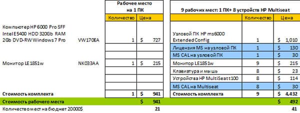 Комплексное предложение от Microsoft и HP выглядит очень привлекательно для школ, библиотек и других публичных заведений, которым требуются компьютерные места (например, интернет-кафе). Вместе с тем надо понимать, что чудес не бывает. Сэкономить в десять раз не получится. И даже в пять раз. Максимально затраты можно будет снизить менее чем в два раза. Ниже приведена таблица, на которой можно увидеть приблизительные подсчеты.