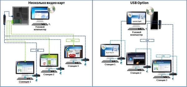 Итак, с программной частью разобрались. И теперь встает вопрос: а каким образом рабочие станции будут подключаться к узловому компьютеру? Здесь есть несколько вариантов. Первый (и самый очевидный) стоит порекомендовать тем, кто хочет использовать уже имеющееся оборудование. Достаточно установить в узловой компьютер столько видеокарт, сколько мы хотим организовать рабочих мест. Далее, мы подключаем мониторы к видеокартам, а мышки и клавиатуры — к USB-хабам.