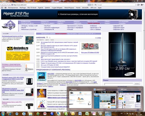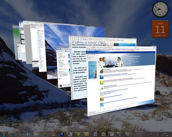 Здесь используется та же Windows Aero, которая была в Vista. Полупрозрачные окна, функция Flip и Flip 3D (отображение всех открытых окон в двухмерном или трехмерном виде при нажатии Alt+Tab и Win+Tab соответственно).