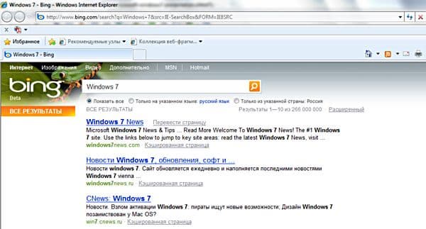 В данном случае основным браузером был выбран Safari 4.0.3. Если же сделать основным браузером Internet Explorer 8 (имеющийся в составе системы), то все будет в порядке, и мы получим результаты поиска в Bing.